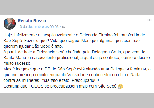 Um post no Facebook de um vereador de São Sepé acabou virando polêmica na rede social. Na quarta-feira, 13, o vereador Renato Rosso (PP), que atua como inspetor da Polícia Civil, publicou um texto lamentando a saída do delegado Antonio Firmino de Freitas Neto do município. Desde a terça-feira, quem está no comando da Delegacia de São Sepé é Carla Dolores Castro. Apesar de elogiar o trabalho da delegada, o parlamentar comentou que “a DP de São Sepé está virando uma delegacia feminina”, fato que o deixou preocupado.