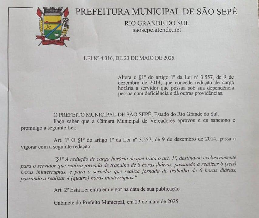 O Prefeito Municipal sancionou, na sexta-feira (23), a Lei nº 4.316/2025, que altera o §1º do artigo 1º da Lei nº 3.557/2014, beneficiando servidores públicos municipais que possuem sob sua dependência pessoa com deficiência.
