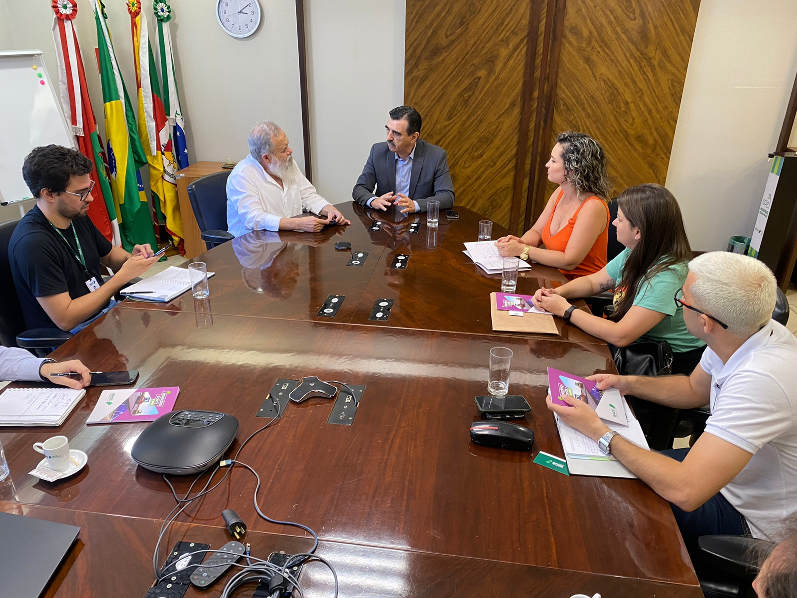 O prefeito João Luiz Vargas, acompanhado do diretor do Escritório de Governo Gabriel Leão, e das técnicas do GAS (Gabinete de Assessoramento Superior) Letícia La Rocca e Janine Corrêa, participou de reunião com o diretor de planejamento Otomar Vivian, onde foram apresentadas as linhas de crédito que o banco trabalha.