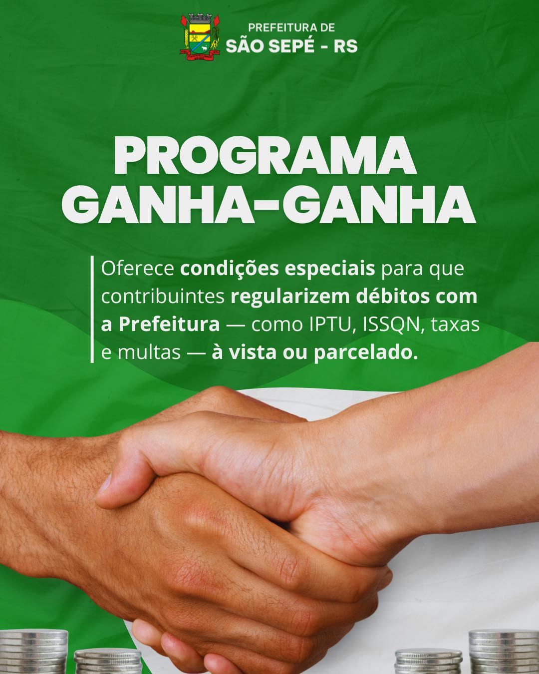 A Prefeitura de São Sepé lançou o Programa “Ganha-Ganha”, uma oportunidade inigualável para que contribuintes possam regularizar débitos e pendências junto ao Município, com condições especiais de adesão.