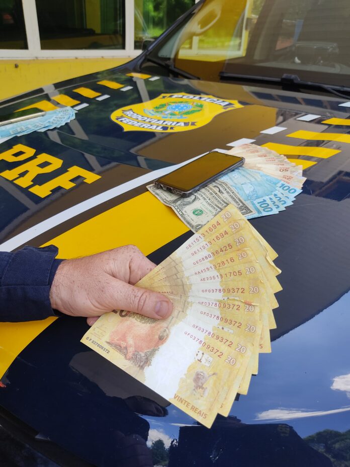 Ao revistarem o automóvel, os policiais encontraram uma carteira com cerca de R$ 3 mil reais, alguns dólares e R$ 400 reais em cédulas de R$ 20 falsificadas.