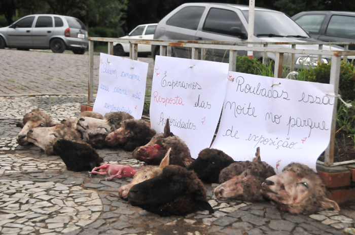 Os produtores expuseram as cabeças dos animais mortos, e um feto, na Praça da Matriz, no centro da cidade. O protesto ocorreu devido o crime ocorrido nesta madrugada, no Parque de Exposição Elyseu Benfica. Os abigeatários carnearam 18 ovelhas no local e levaram 7 vivas, segundo Ferreira.