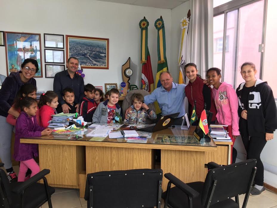 Na manhã desta terça-feira, 23, os pequenos do primeiro ano, acompanhados da professora Joana Brum, realizaram uma visita à Prefeitura. O grupo foi recebido pelo chefe do Executivo, Léo Girardello e o vice-prefeito, Kéio Santos. Na oportunidade, as crianças presentearam as lideranças com flores, fizeram pedidos e conheceram um pouco do trabalho realizado no gabinete.