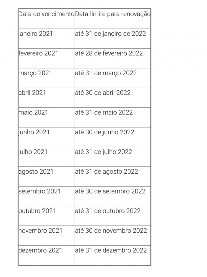 A recomendação é que a renovação da CNH seja feita até esse prazo para aqueles que pretendem continuar conduzindo. Conforme previsto na normativa federal, para fins de fiscalização de trânsito, consideram-se válidas as habilitações vencidas desde 1º de março de 2020 e com vencimento até 31 de dezembro de 2021, até a nova data correspondente para renovação definida nas tabelas. Isso também se aplica às informações contidas na CNH, inclusive aos certificados de cursos especializados que não constam na CNH, e às Permissões para Dirigir.