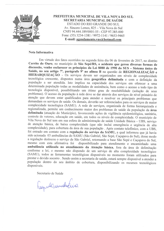 De acordo com o órgão, o fato ocorrido na rodovia (em perímetro de São Sepé) compreendia caso de complexidade no atendimento, razão pela qual foi acionado, via regulação, a busca de unidades disponíveis ao atendimento, já que o município de Vila Nova não possui SAMU. O documento assinado pelo secretário da pasta, Fagner Leandro Viera, cita que ao menos três cidades (São Gabriel, Caçapava do Sul e São Sepé) haviam sido notificadas da necessidade do atendimento. Ao serem informados de que a unidade de São Gabriel já estava em deslocamento, os outros dois SAMU acabaram retornando para suas bases.