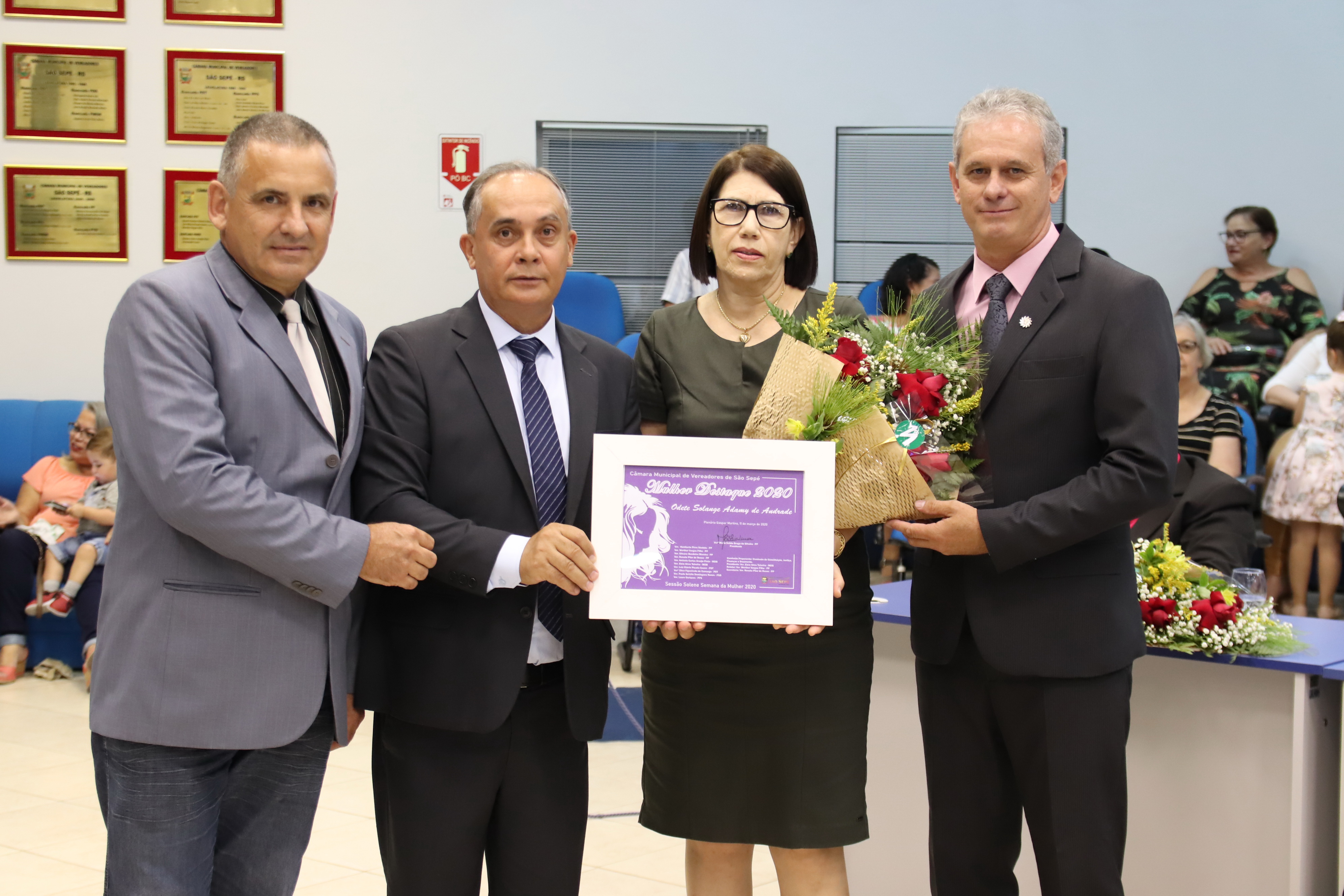Encerrando as homenagens da noite, Odete Solange Adamy de Andrade foi a indicada pela Comissão de Constituição, Justiça, Finanças e Orçamento. Odete Solange é Escrivã Judicial na 1ª Vara Judicial da Comarca de São Sepé. A Comissão é presidida pelo vereador Elcio Teixeira, relator Eto Vargas e secretário Renato Rosso.