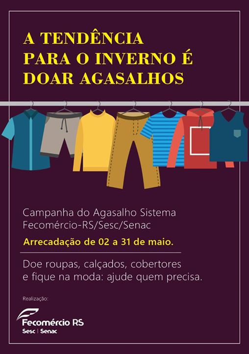 Com o tema “A Tendência para o Inverno é Doar Agasalhos”, a ação social segue em todas as Unidades de Sesc e Senac e nas sedes dos sindicatos. O objetivo da iniciativa é mobilizar toda comunidade, colaboradores e parceiros a abraçarem esta causa e fazer com que o inverno de muitas pessoas que estão em situação de vulnerabilidade social seja mais aquecido.