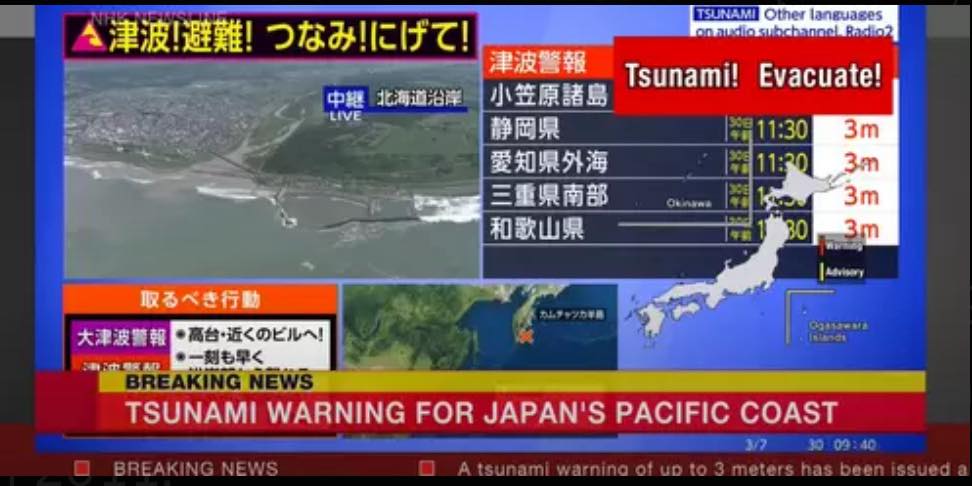 A TV estatal japonesa disse que o tsunami chegou ao norte do país, mas com ondas abaixo de 1 metro. O governo do Japão prevê que novas ondas podem atingir até 3 metros e emitiu alertas de emergência para a população.