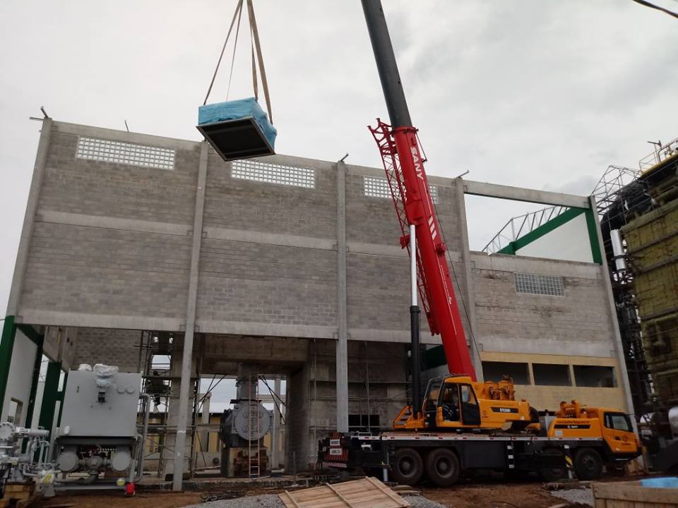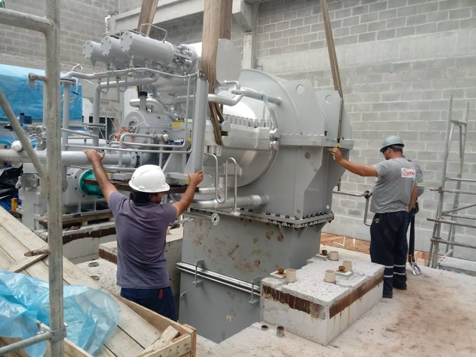 Nesta semana começou a instalação dos equipamentos de geração de energia na casa de força da Termelétrica São Sepé. As turbinas, geradores, unidades hidráulicas, redutores de velocidade e condensador são equipamentos grandes e pesados, e para instalar tiveram de ser içados por cima da casa até serem acoplados e fixados nas bases de concreto que foram preparadas para esta finalidade. Após a fixação das máquinas começa a montagem dos equipamentos elétricos e de automação da usina.