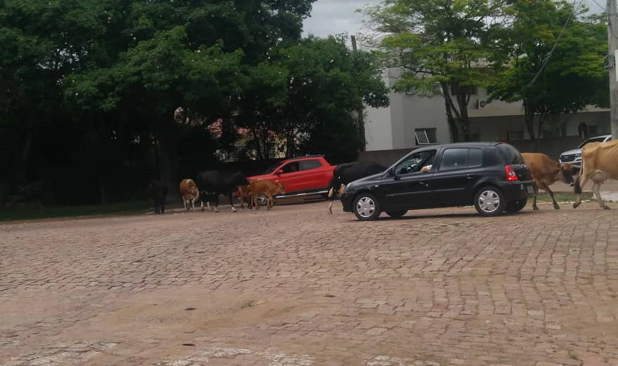 Ao menos 10 vacas foram vistas “passeando” próximo ao trevo, em um dos locais com maior movimento de veículos da cidade. O ponto fica na esquina das ruas Riachuelo com Tuiuti e Avenida José Calil.
