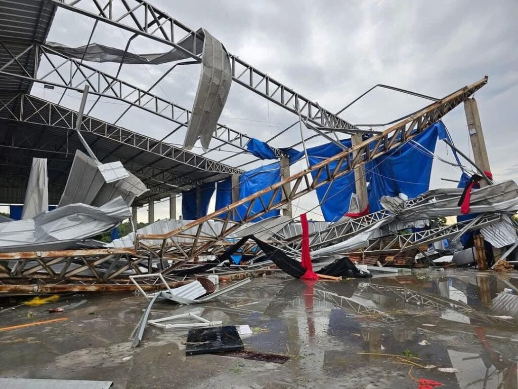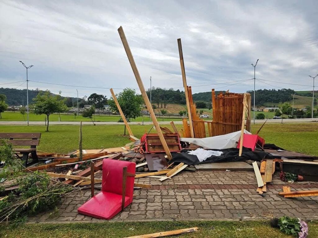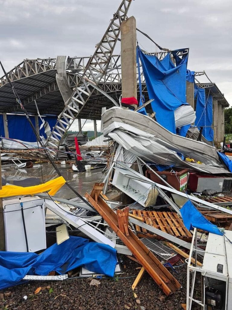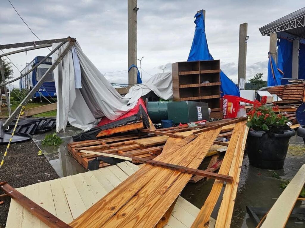 Imagens registradas na manhã desta segunda-feira mostram os estragos no Parque de Eventos, enquanto a cidade tenta se recuperar dos impactos do vendaval. Fonte. AR Notícias 24 horas