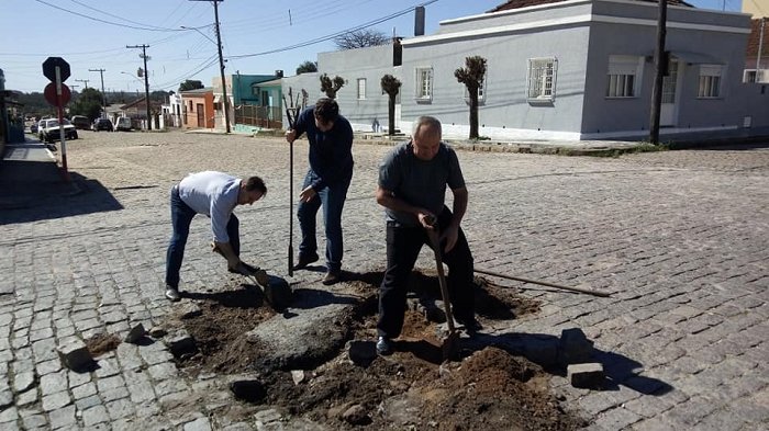 Os vereadores de Caçapava do Sul, Mariano Teixeira, Ricardo Rosso, Alex Vargas e Zilmar Araújo (Mano), realizaram na tarde de quarta-feira, 5, um novo mutirão para reposição de calçamento em mais um buraco no centro da cidade, agora foi na Rua Borges de Medeiros. Na semana passada os mesmos vereadores fizeram esta ação e taparam um buraco aberto há mais de seis meses na avenida Presidente Kennedy.